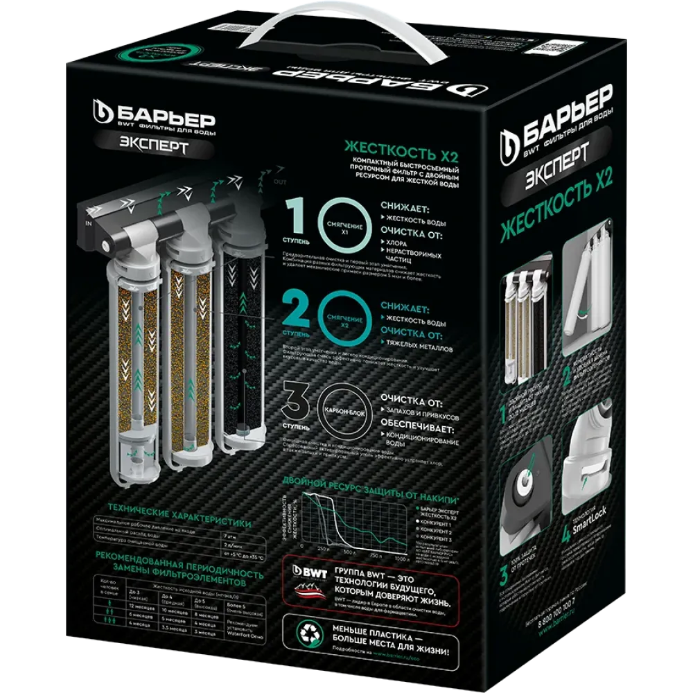 2. "БАРЬЕР ЭКСПЕРТ Смягчение х2" – сочетание сорбционной очистки и второй этап умягчения. Удаляет остаточные тяжелые металлы и накипь.