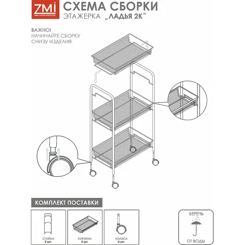 Этажерка, органайзер «Ладья 2К» отлично подходит для хранения хозяйственных вещей в ванной комнате, спальне, прихожей, офисе. Три вместительные полки, размещенные на разной высоте, позволяют класть разные предметы и не затрудняет доступ к ним. Максимальная допустимая нагрузка на одну корзину до 10 кг. Сама конструкция изготовлена из прочной, высококачественной стали, повышающей износостойкость изделия, что увеличивает срок службы. Также ее ножки оснащены небольшими колесиками, с помощью которых ее можно с легкостью перекатывать с одного места на другое.