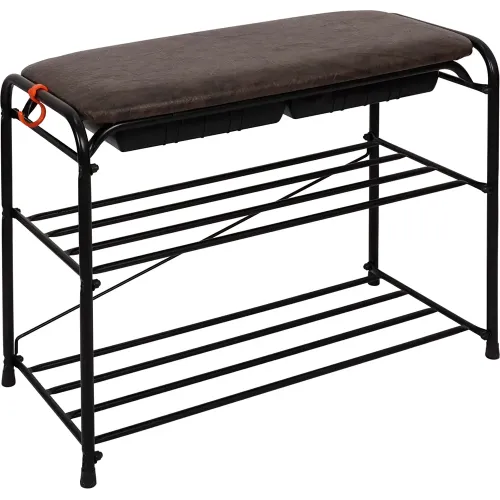 Металлическая подставка для обуви Альфа 23СЯ от российского производителя "ЗМИ"- это отличное решение для аккуратного и компактного хранения обуви в доме или квартире. Узкая, но вместительная мебель помогает легко организовать пространство в гостинной, гардеробной, коридоре. Классический дизайн впишется в любой интерьер. Долговечная, благодаря каркасу и полочкам из металла с полимерно-порошковым покрытием. Универсальная банкетка содержит 2 яруса, на которых с лёгкостью помещается до 6 пар обуви. Разрешенная нагрузка на одну полку - 8 кг. Мягкое сиденье из прочной винилискожи выдерживает до 120 кг нагрузки - на него можно присесть самому или посадить ребенка при обувании. Под откидным сиденьем расположены два пластиковых ящика для таких мелочей, как ключи и различные обувные аксессуары.