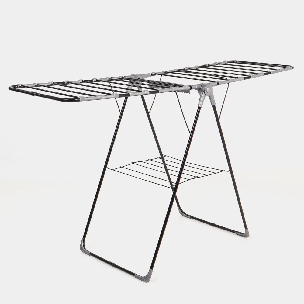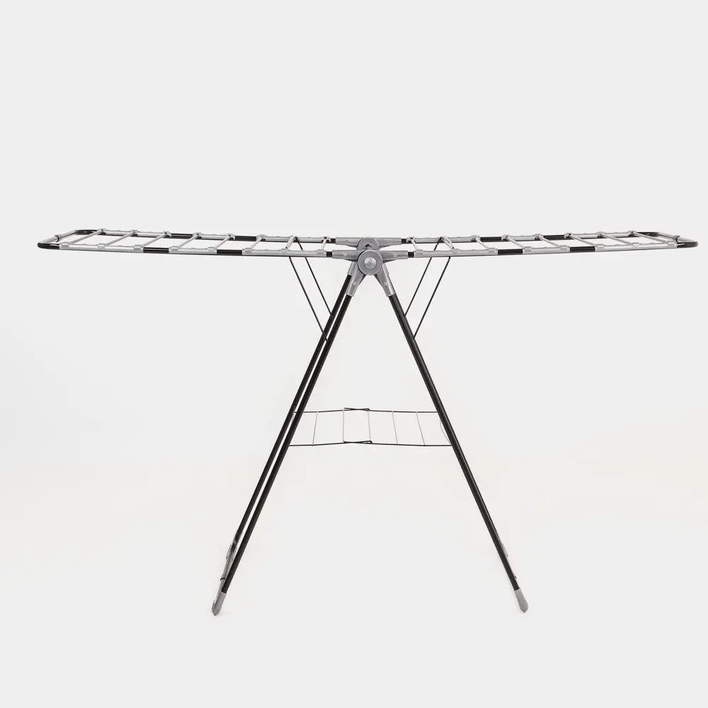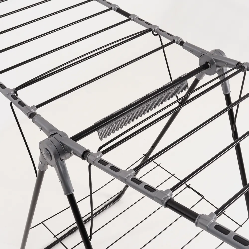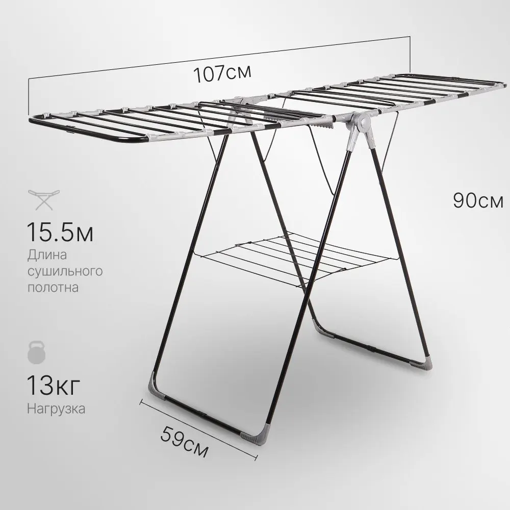 Rasflashadigan yon qanotli metall quritgich kiyimlarni tartibli osish va tezroq quritish imkonini beradi. Mustahkam karkas va ishonchli biriktirish tugunlari barqaror turishni ta’minlaydi. Ishlatib bo‘lgach, buklanadigan kir quritgich tez yig‘iladi va juda kam joy egallaydi.